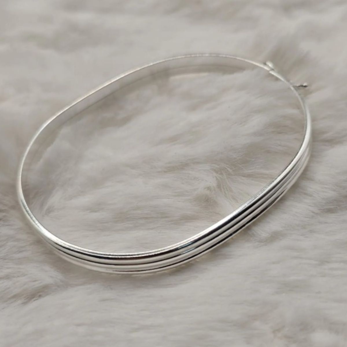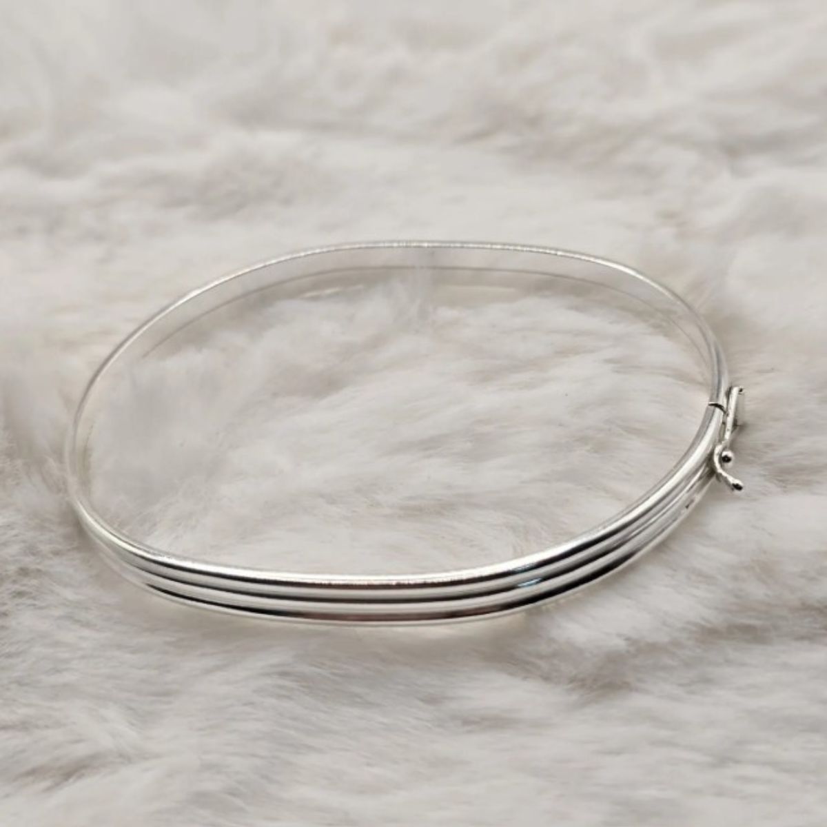 Acabamento e produção A peça é confeccionada em prata de lei 925, conhecida pela resistência e pelo brilho duradouro. O acabamento polido realça o aspecto luminoso da prata, enquanto o trabalho no fio abaulado adiciona relevo e interesse tátil. A união dos três filetes é feita de forma discreta e precisa, preservando a leveza do bracelete e garantindo um caimento confortável no pulso. A peça passa por polimento final para eliminar imperfeições e proporcionar uma superfície homogênea e brilhante.