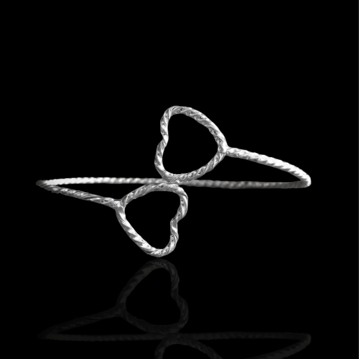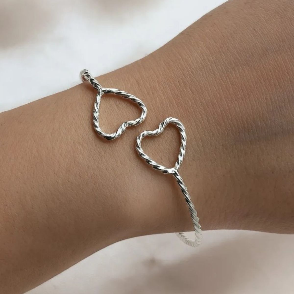 Seu design em fio torcido de 2mm traz um toque artesanal e elegante, valorizando o pulso com leveza e estilo. As extremidades são finalizadas com dois delicados corações, símbolo de amor, afeto e conexão, tornando a peça ainda mais especial e cheia de personalidade.