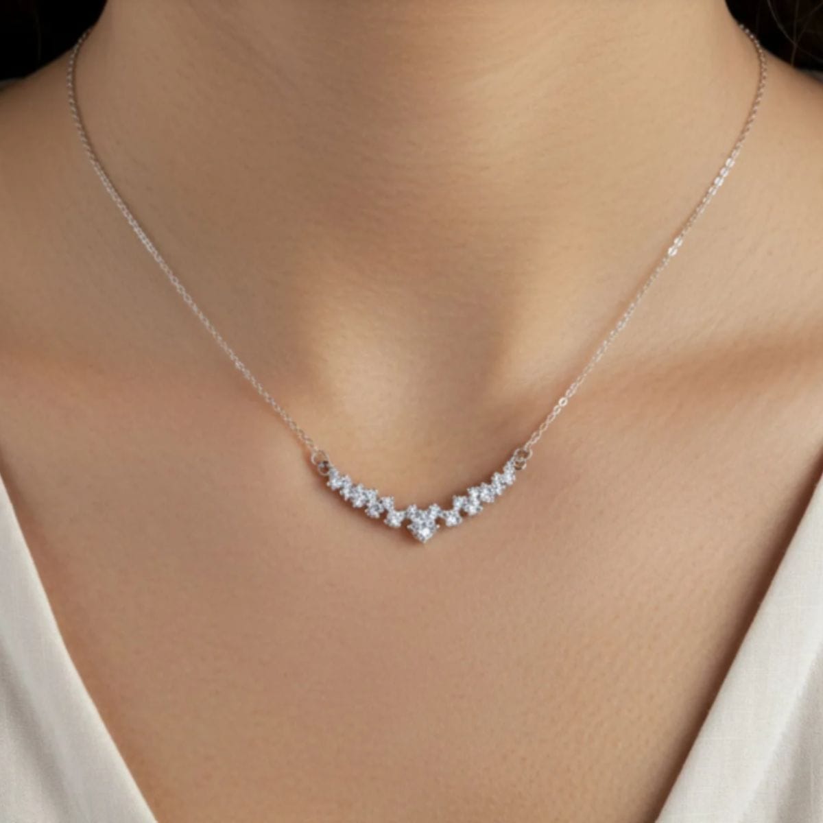 Uma corrente delicada e moderna, com pingente de pontos de luz que criam um efeito alongado e elegante no colo. O brilho suave das zircônias ilumina a peça com leveza, trazendo um visual sofisticado e versátil. Perfeita para o dia a dia ou para compor mix de colares com charme discreto.