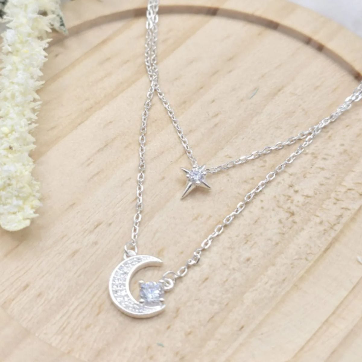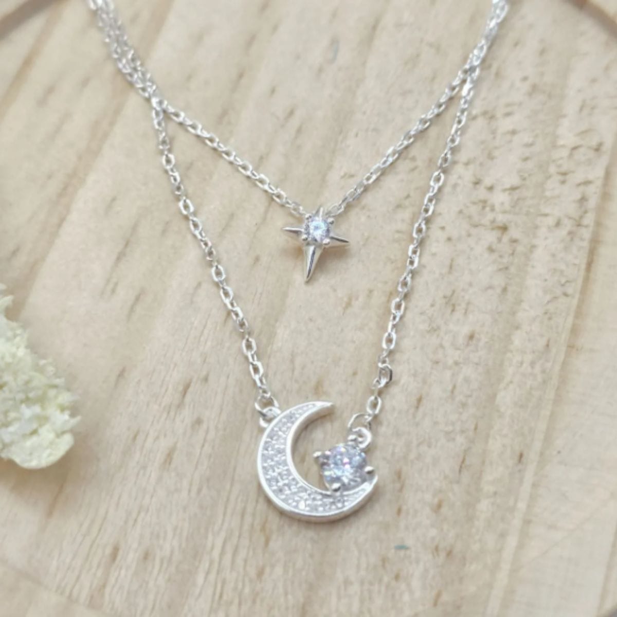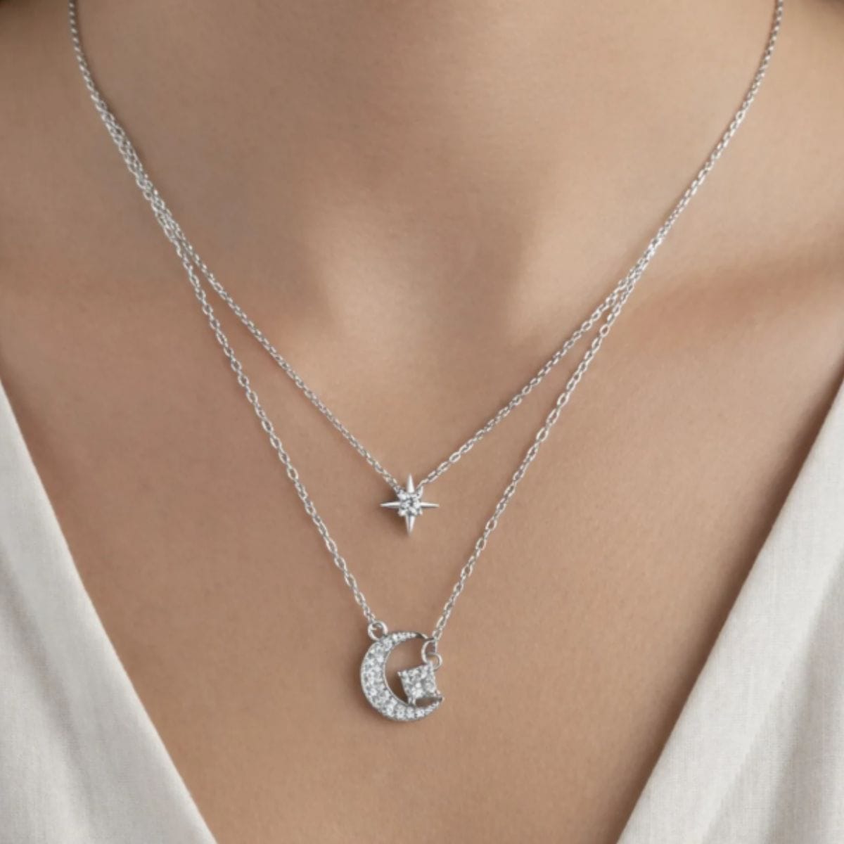 Uma corrente dupla delicada e cheia de encanto, que une a estrela e a lua em um design harmonioso e luminoso. As zircônias adicionam um brilho suave e elegante, criando um visual celestial que transmite leveza, romantismo e significado. As duas camadas valorizam o colo com equilíbrio, tornando a peça perfeita para quem gosta de joias delicadas, mas cheias de presença.
