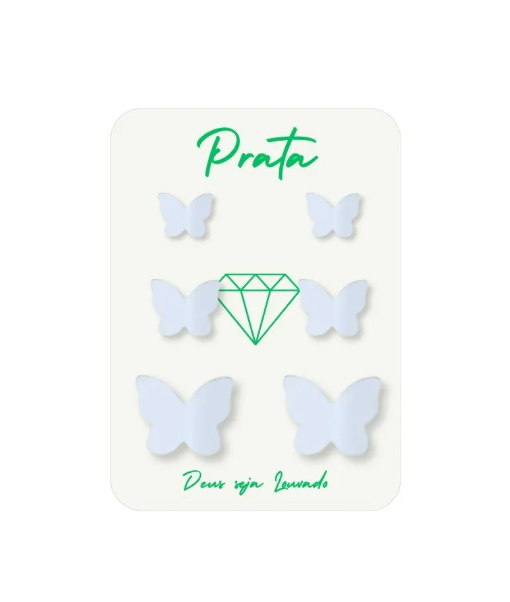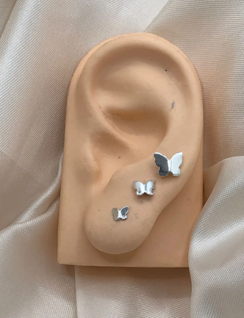 Trio de Brincos de Borboleta de Prata 925, 4mm, 5mm e 6mm. Modelo fixo, confeccionados em Prata Legítima.
