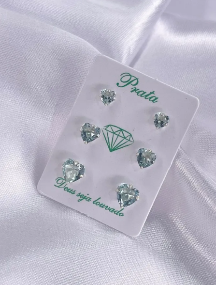 Trio de Brincos de Prata 925 Coração Zircônia 4x4mm, 5X5mm e 6x6mm. Modelo fixo com pedra de zircônia Coração, presa por quatro garras. Confeccionados em Prata Legítima.