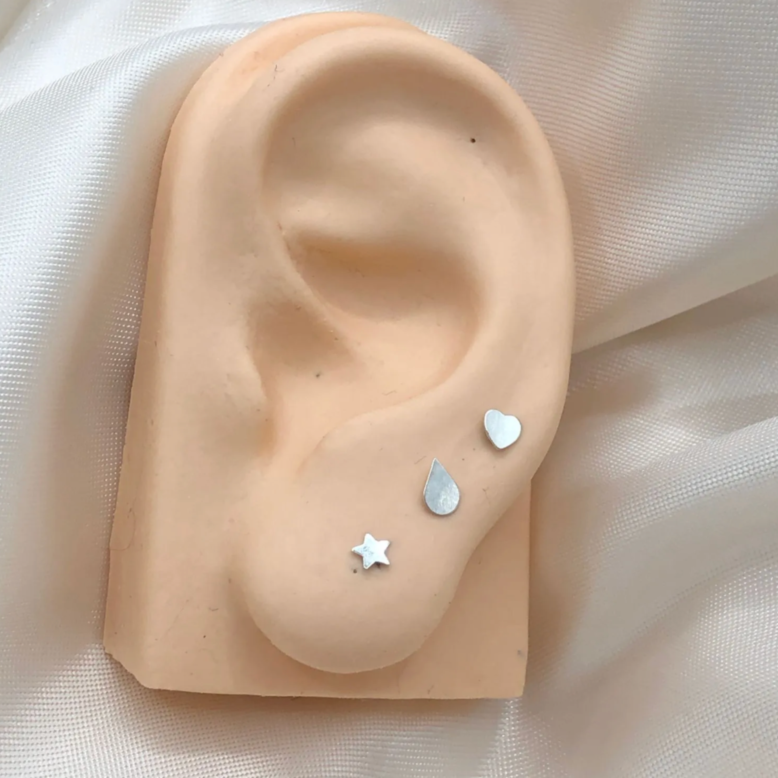 Trio de Brincos de Prata 925 de coração, estrela e gota de 5mm. Modelo fixo, confeccionados em Prata Legítima.