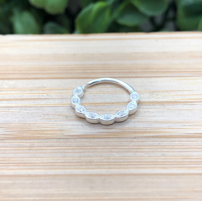 Com um design elegante e cheio de brilho, esse piercing para septo apresenta detalhes ovais cravejados com zircônias, que formam um contorno delicado e marcante ao mesmo tempo. Ideal para quem busca uma peça com acabamento refinado e visual sofisticado, sem abrir mão do conforto no uso diário.