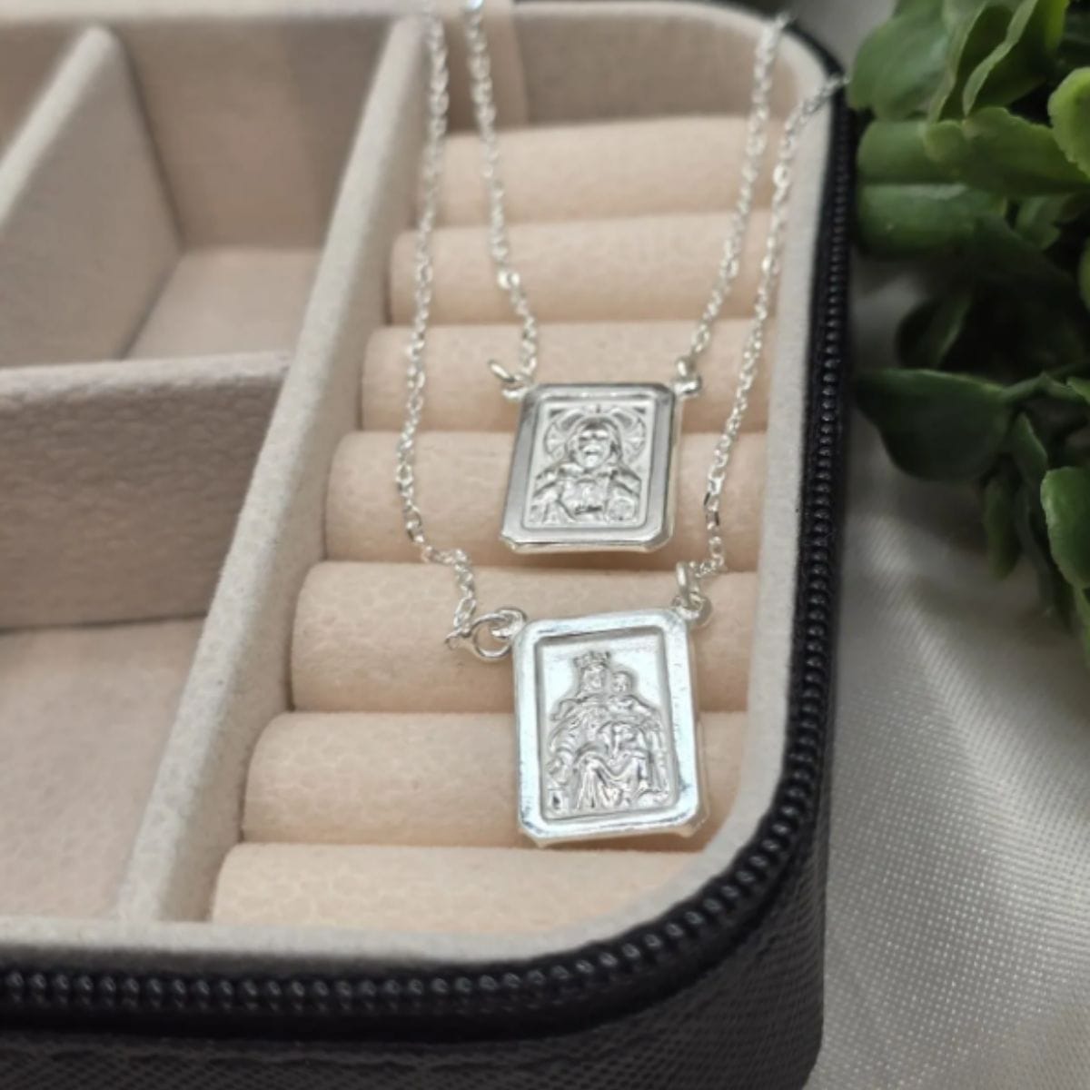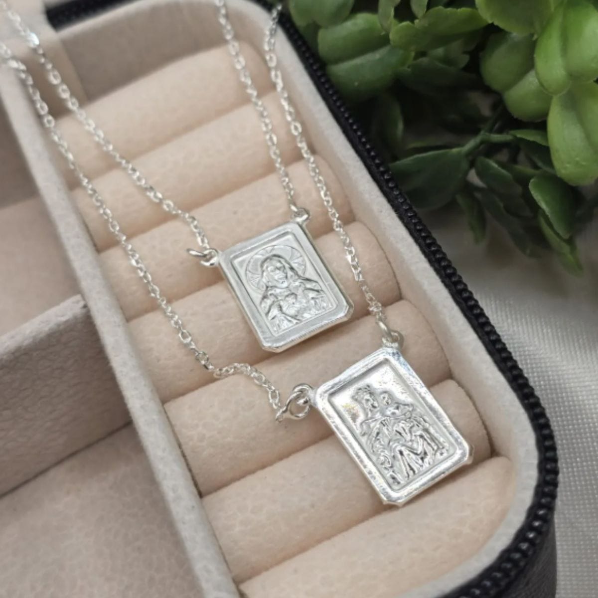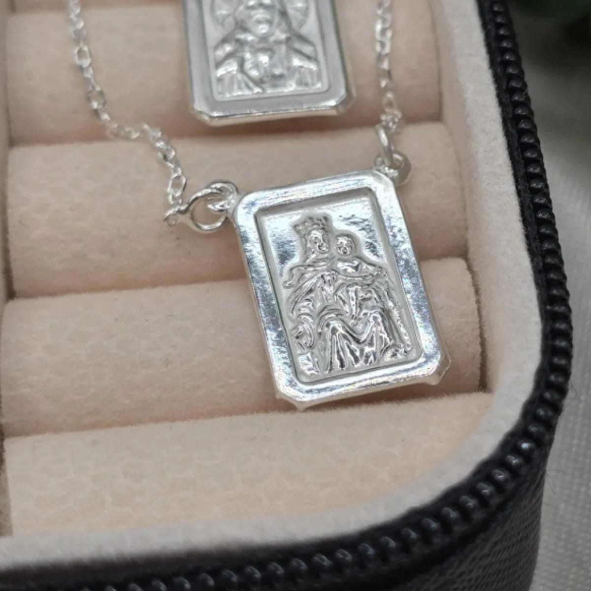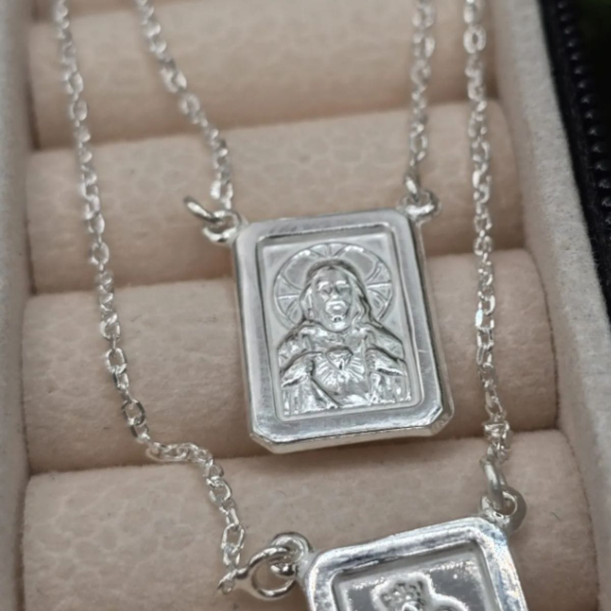 O escapulário de prata 925 com elo português e pingentes de Nossa Senhora do Carmo e do Sagrado Coração de Jesus é uma joia que une fé, tradição e elegância. Símbolo de proteção e devoção, essa peça carrega um profundo significado espiritual, ideal para quem deseja expressar sua crença no dia a dia com discrição e sofisticação.