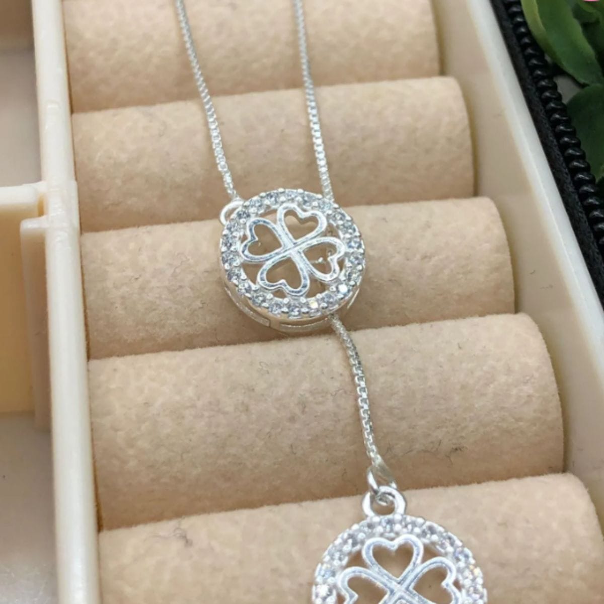 Delicada e cheia de significado, a Gravatinha de Prata 925 com Círculo e Trevo Cravejado é uma joia que une simbolismo e elegância em cada detalhe. O trevo, conhecido por representar sorte e proteção, ganha ainda mais destaque com o brilho dos craves, criando um visual sofisticado e moderno. Seu design versátil é perfeito para compor desde produções do dia a dia até looks mais refinados, adicionando um toque de charme e luminosidade ao seu estilo.