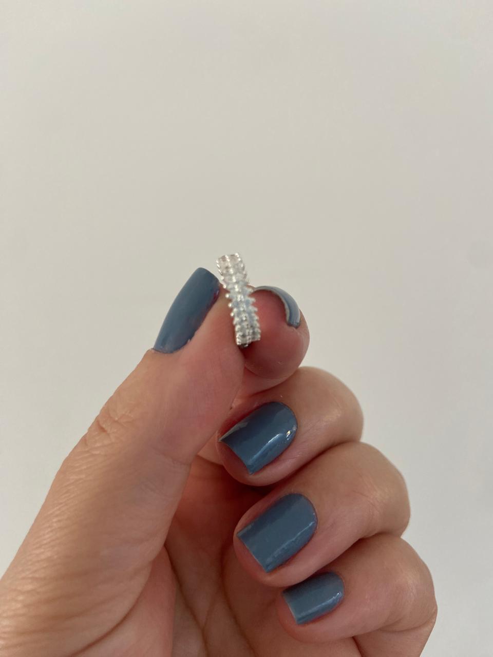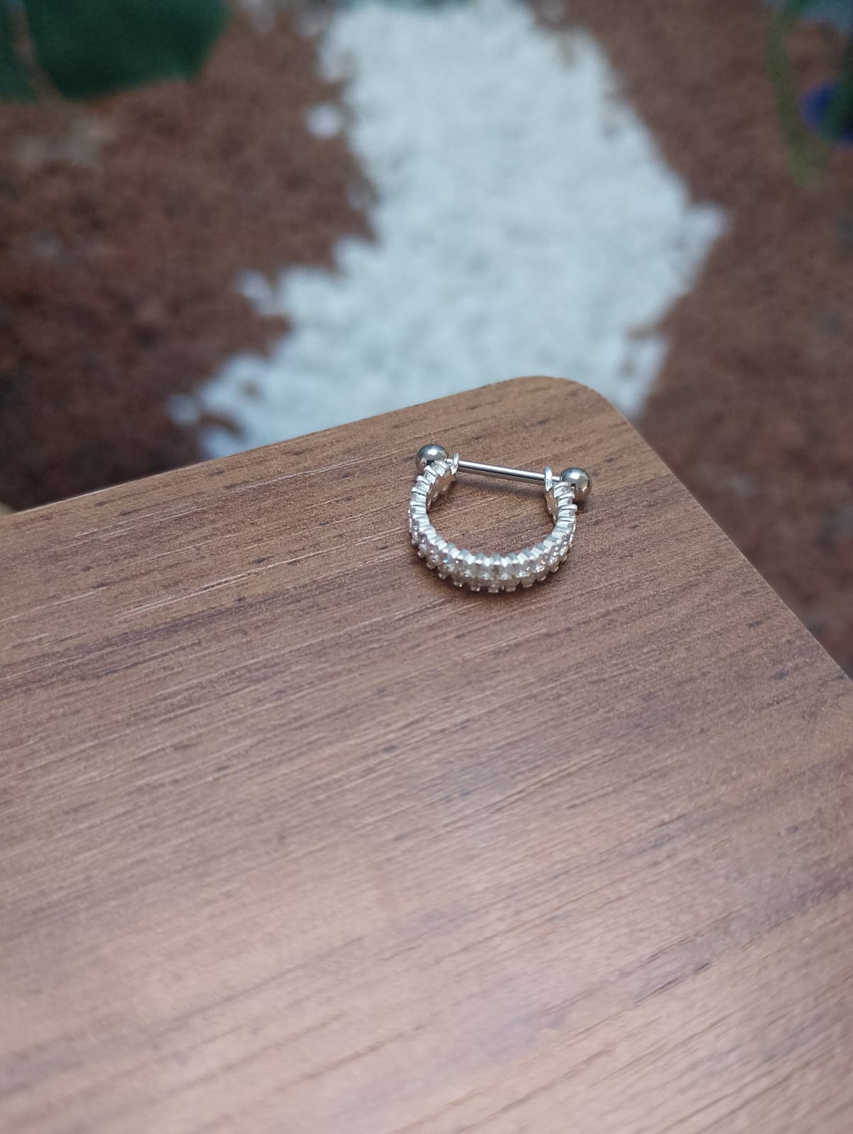 O piercing de prata 925 com dois filetes cravejados é uma peça moderna e sofisticada, desenvolvida especialmente para a região da conch. Seu design alongado com zircônias garante brilho intenso e elegante, transformando o visual em uma composição cheia de estilo.