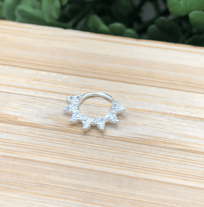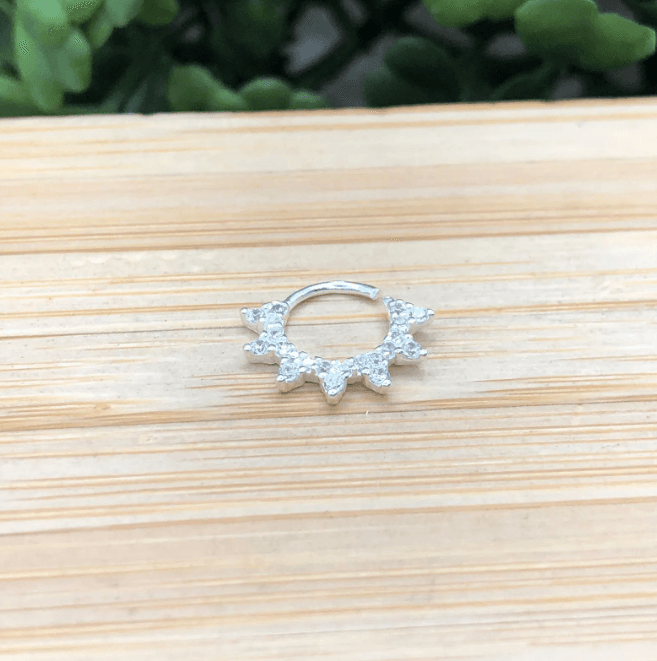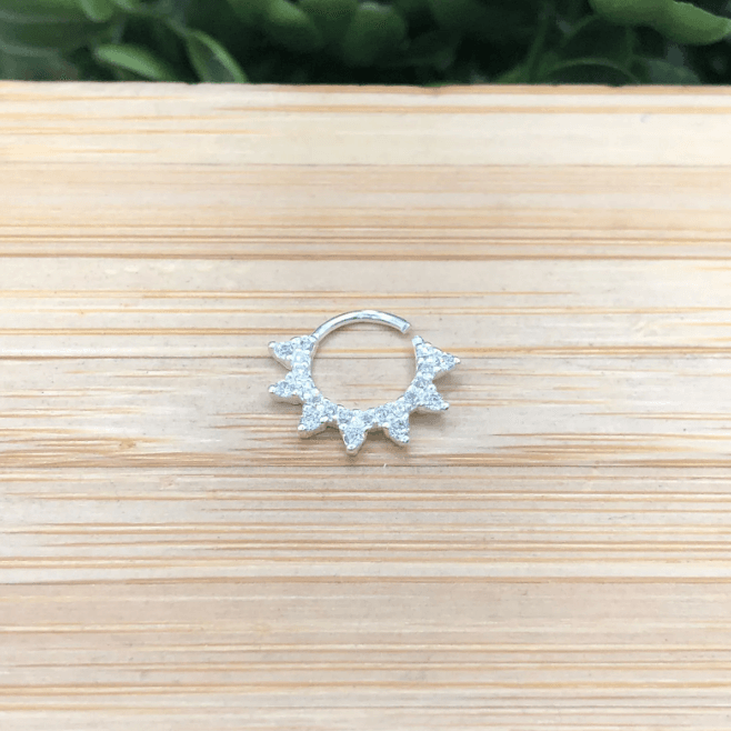 Cheio de atitude e brilho, esse piercing estilo spike cravejado traz um visual ousado e moderno para o septo. O formato pontiagudo e delicado ganha destaque com a aplicação de zircônias, criando uma peça marcante, mas ao mesmo tempo elegante. Ideal para quem ama acessórios com personalidade forte e acabamento impecável.