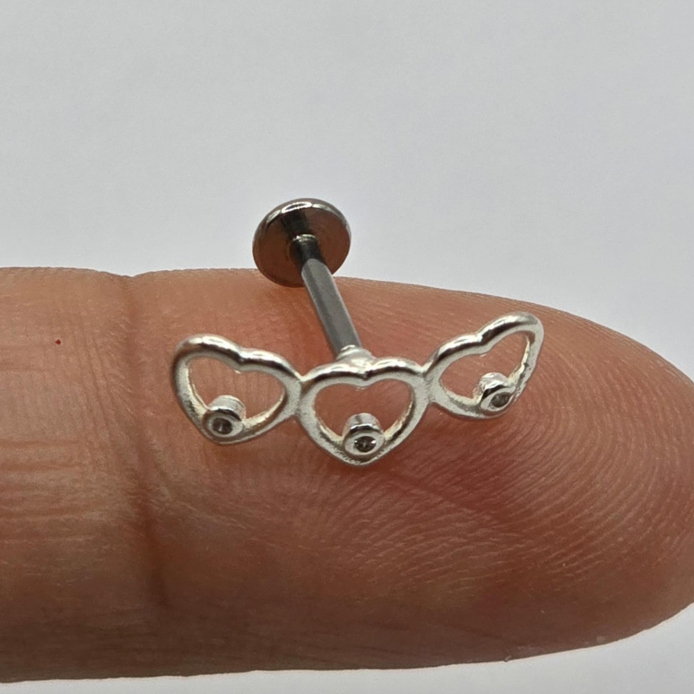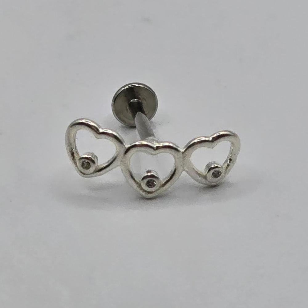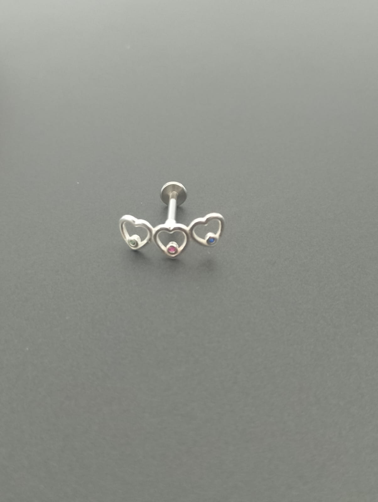 O piercing de prata furo três corações vazados é uma peça delicada e moderna, perfeita para quem busca um toque de estilo e elegância em seu visual.