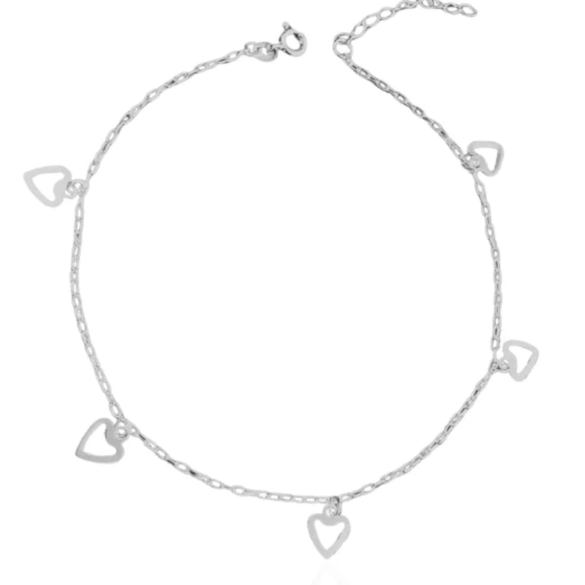 A Tornozeleira Feminina 5 Corações Vazados é uma peça delicada, feita com prata 925 de alta qualidade e material hipoalergênico.