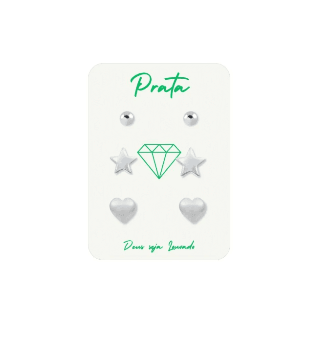 Trio de Brincos de Prata 925 de coração, estrela e Bolinha de 5mm. Modelo fixo, confeccionados em Prata Legítima.