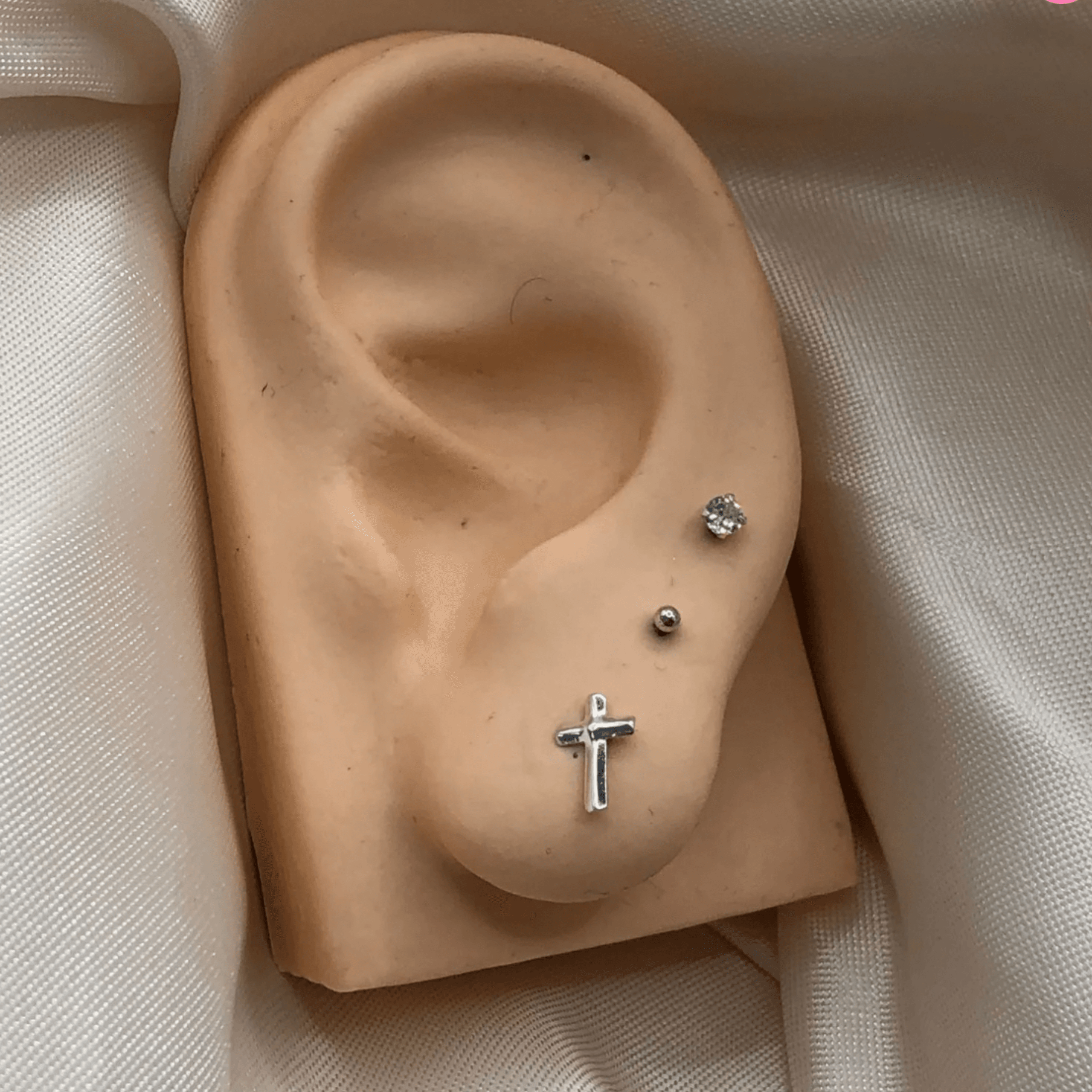 Trio de brincos de prata 925 bolinha, cruz e pedra branca
