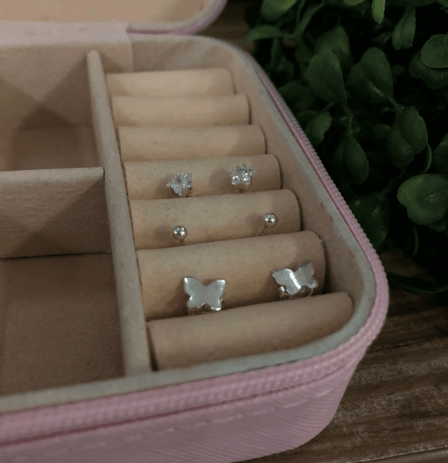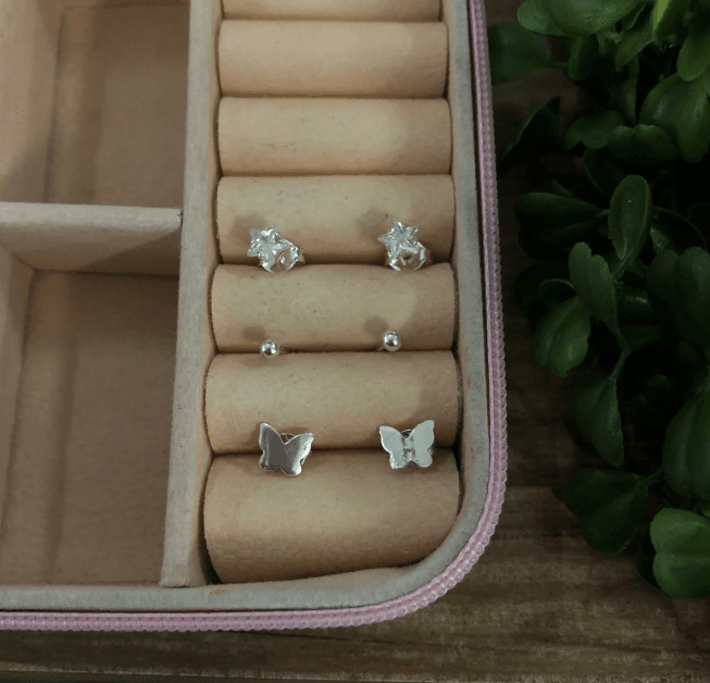 Trio de Brincos de Prata 925, estrela com pedra branca, bolinha em prata e borboleta chapada. Modelo fixo, confeccionados em Prata Legítima.