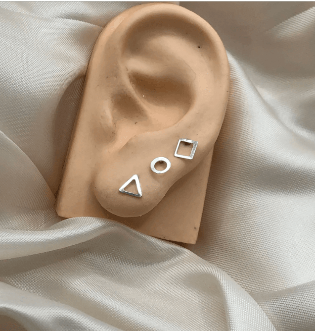 Trio de Brincos de Prata 925 Formas Geométricas com design moderno e minimalista. O conjunto inclui três pares de brincos vazados — redondo, triângulo e quadrado — perfeitos para compor looks criativos, usar em segundo furo ou combinar entre si. Leves, confortáveis e cheios de estilo para o dia a dia.