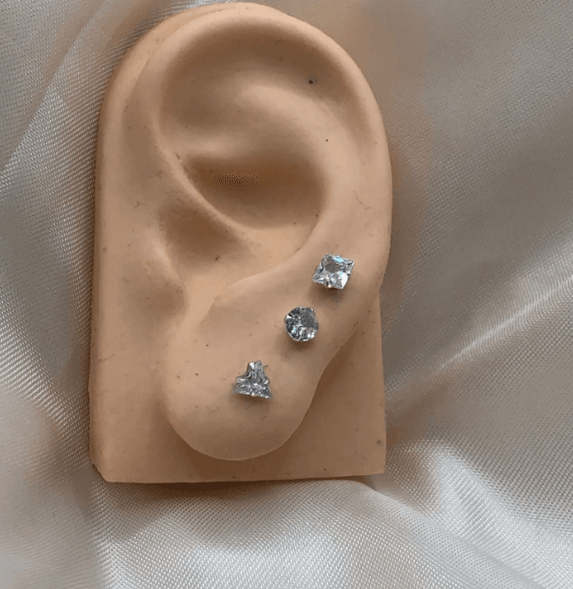 Trio de Brincos de Prata 925 redondo, triângulo e quadrado de 5mm na cor branca. Modelo fixo com pedra de zircônia Estrela, presa por quatro garras. Confeccionados em Prata Legítima.