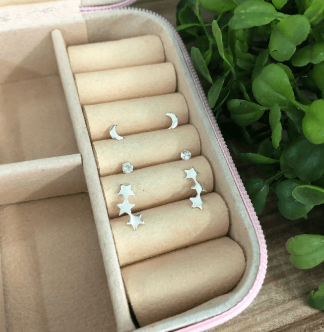 Trio de Brincos de Prata 925 de 3 estrelas, pedra redonda branca e lua. Modelo fixo, confeccionados em Prata Legítima.