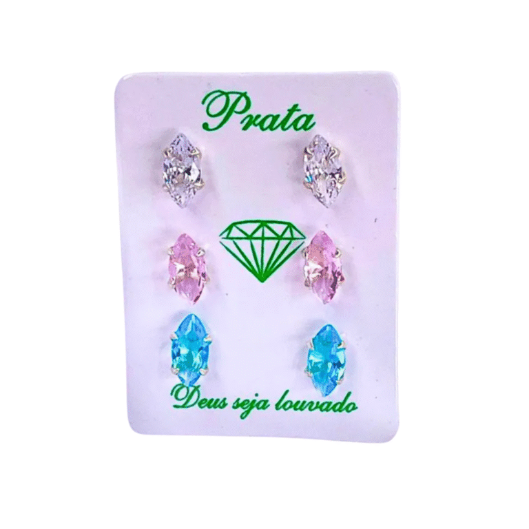Trio de Brincos de Prata 925 Navete Zircônia. Modelo fixo com pedra de zircônia Navete, presa por quatro garras. Confeccionados em Prata Legítima.