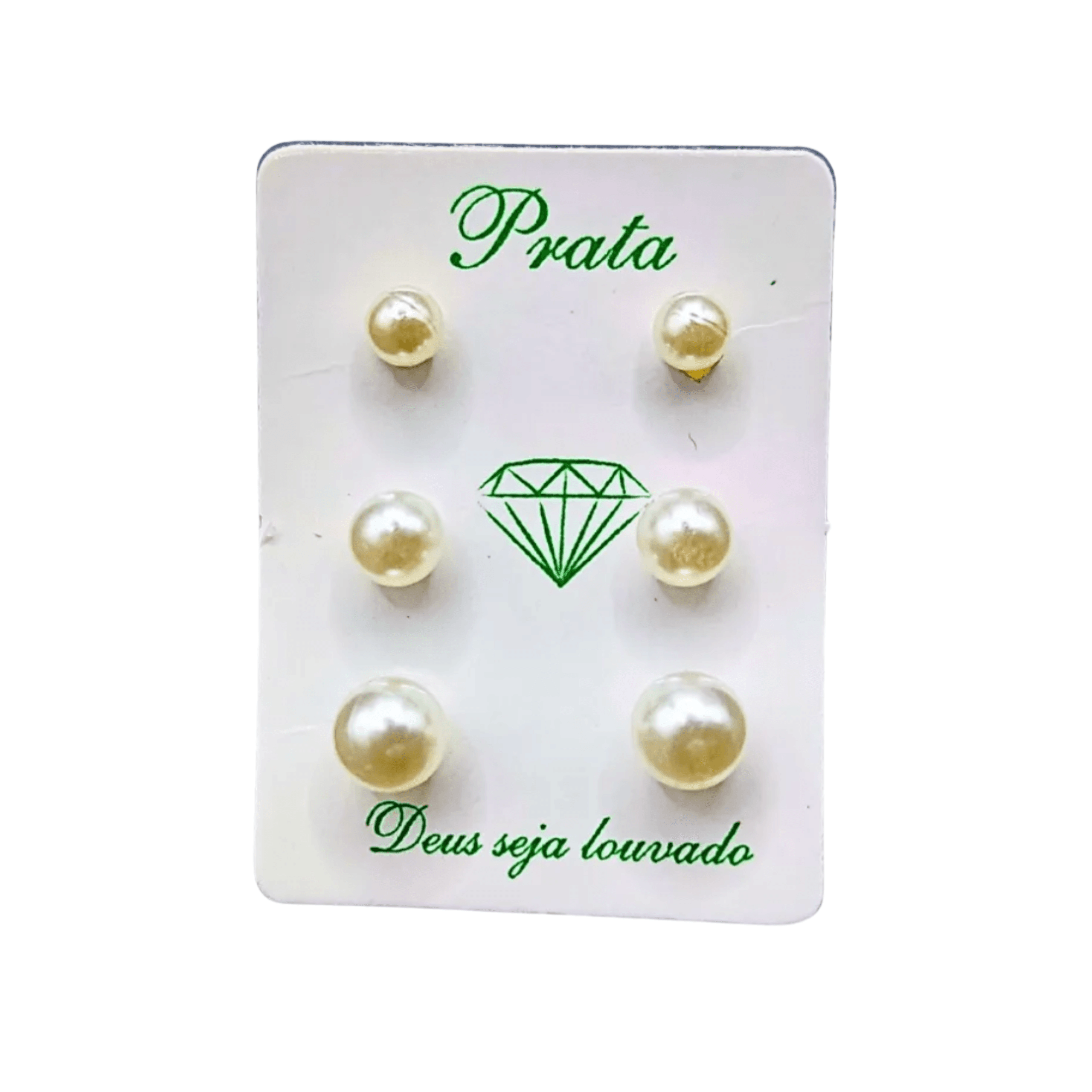 Trio de Brincos de Prata 925 com Pérola de 4mm, 5mm e 6mm. Modelo fixo com pedra de zircônia Redondo, presa por quatro garras. Confeccionados em Prata Legítima.