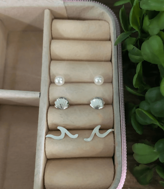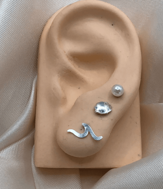 Trio de Brincos de Prata 925 de perola, concha e onda. Modelo fixo, confeccionados em Prata Legítima.