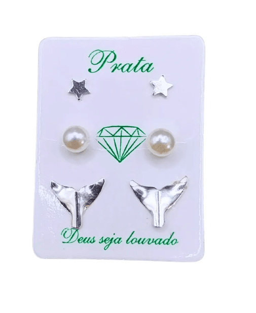Trio de Brincos de Prata 925 de estrela, Perola e sereia. Modelo fixo, confeccionados em Prata Legítima.