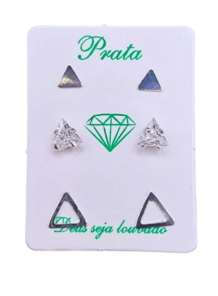 Trio de Brincos de Prata 925, triângulo chapado, triângulo vazado e triângulo com pedra branca. Modelo fixo, confeccionados em Prata Legítima.